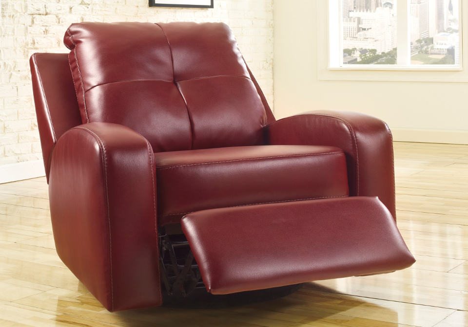 tufted back cushion provides ample support while subtle topstitching weaves a stylish touch. Smooth gliding motion provides extra comfort and the 360-degree swivel offers freedom to face in any direction. The reclining lever is easily accessible yet cleverly hidden on the inside of the arm. Seating area is covered in lush DuraBlend® that provides the look and feel of leather without the cost.