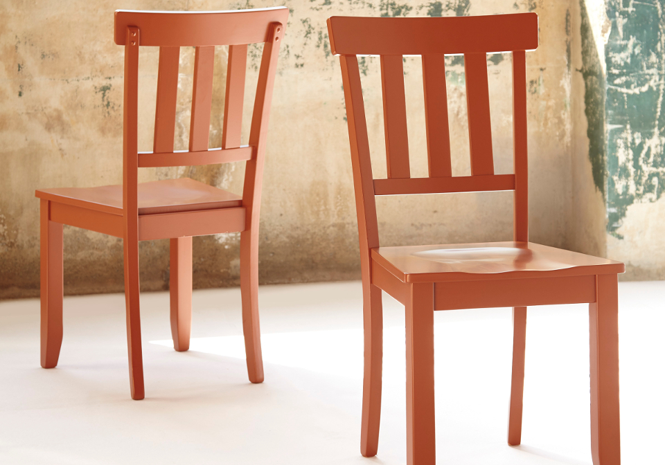 The country farm house style of the “Bantilly” dining collection features a beautiful butch block inlayed veneer covered in a nearly clear finish that perfectly shows off the natural wood inlay along with the option of blue or gray color chairs to complete the casual design.