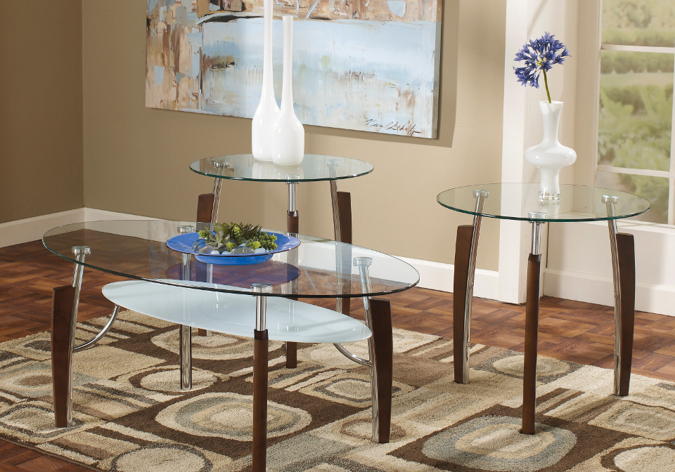 Beyond their sleek shape—it’s the textural mix of materials that makes this coffee table set so striking. The shine of metal is softened by rich wood-color accents—while clear and frosted glass tops and shelving take this contemporary look over the top.